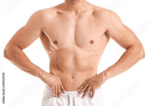 © Pixel-Shot, Fototapeta premium Handsome muscular man on white background. Weight loss concept