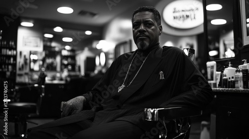 © YuliaLyubimova, Fototapeta premium Handsome older man sits in a barber chair in the stylish barber salon. hairstyle content