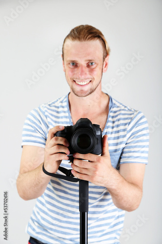 Obraz premium Handsome photographer with camera on monopod, on gray