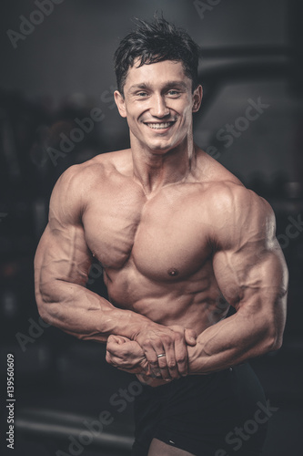 © antondotsenko, Fototapeta premium Handsome power athletic man on diet training pumping up muscles