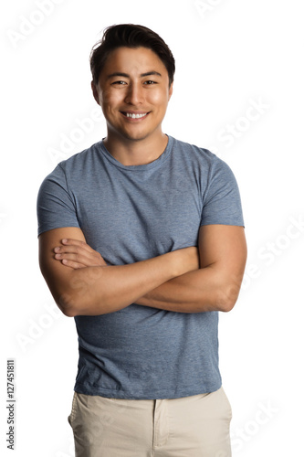 © _robbie_, Obraz premium Handsome relaxed man wearing a tshirt and pants standing against a white background, relaxed looking.