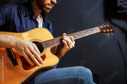 © Dmytro Panchenko, Obraz premium Handsome rock guitarist practicing.