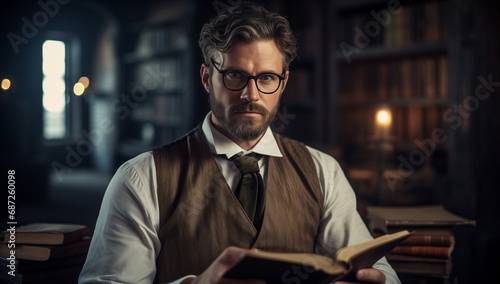 Fototapeta premium Handsome School Teacher, Educator, and Mentor in Thoughtful Pose, Symbolizing Knowledge, Guidance, and Dedication to Learning. Ideal for Educational and Professional Concept Designs