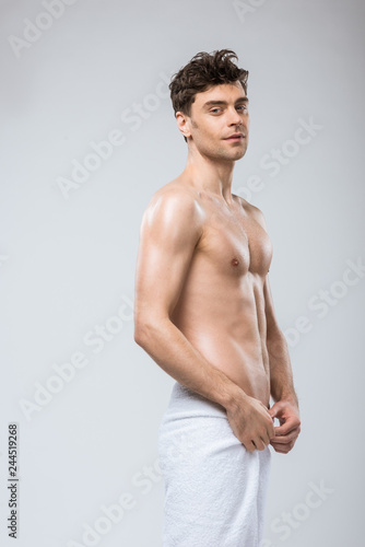 Fototapeta premium handsome sexy man posing in towel isolated on grey