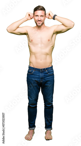 © Krakenimages.com, Fototapeta premium Handsome shirtless man showing nude chest Smiling pulling ears with fingers, funny gesture. Audition problem
