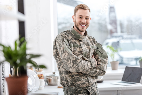 Fototapeta premium Handsome soldier smiling and looking at camera in kitchen