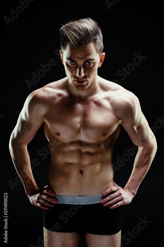 © smmartynenko, Fototapeta premium Handsome sporty young man in underwear posing on dark background