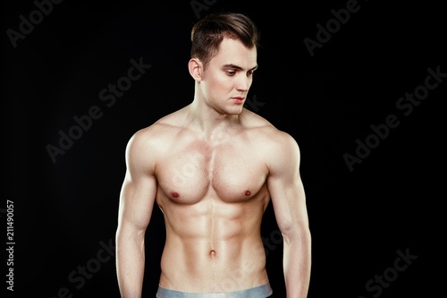 © smmartynenko, Fototapeta premium Handsome sporty young man in underwear posing on dark background