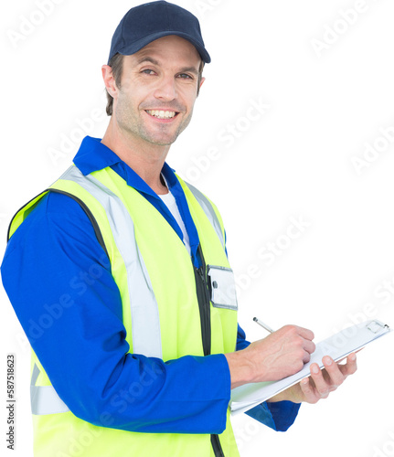 © vectorfusionart, Naklejka premium Handsome supervisor writing notes on clipboard