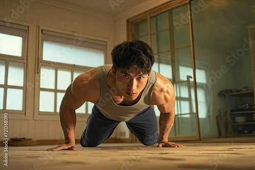 © Kitta Studio, Fototapeta premium Handsome young Asian man doing push-ups on the floor at home