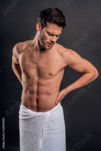 © Roman, Fototapeta premium Handsome young bearded man isolated. Portrait of topless muscular man is standing on gray background. Man holding his back. Experiencing backache.