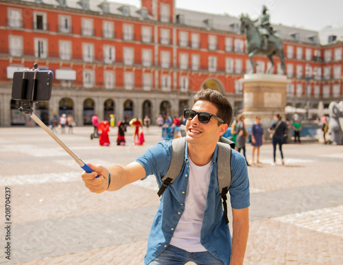 © SB Arts Media, Fototapeta premium Handsome young caucasian tourist man happy and excited taking a
