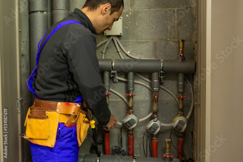 © Angelov, Fototapeta premium Handsome young man builder installing