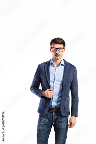 Fototapeta premium Handsome young man in blue jacket. Studio shot, isolated.