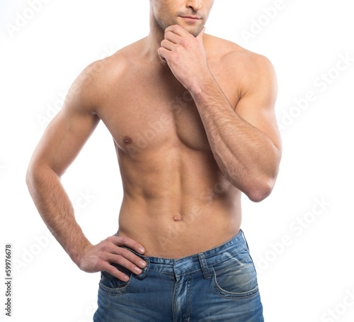 © Nejron Photo, Fototapeta premium Handsome young man in blue jeans with naked torso