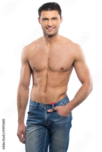 © Nejron Photo, Fototapeta premium Handsome young man in blue jeans with naked torso