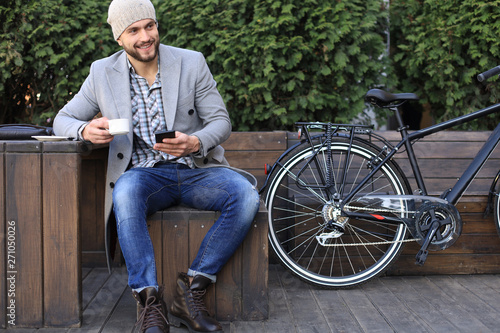 Obraz premium Handsome young man in grey coat and hat using smartphone, resting, and smiling while sitting near his bicycle outdoors.