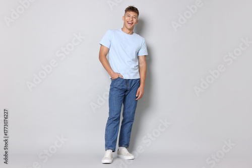 Fototapeta premium Handsome young man in stylish jeans on light grey background