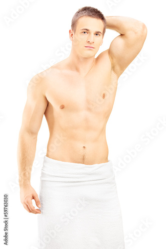 © Ljupco Smokovski, Fototapeta premium Handsome young man in white towel posing after shower