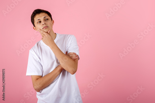 © speed300, Obraz premium Handsome young man on pink background thinking an idea