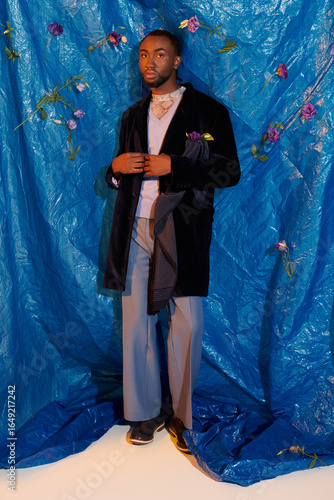 Fototapeta premium Handsome young man poses elegantly against a vibrant blue backdrop adorned with flowers