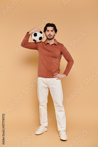 Fototapeta premium Handsome young man posing confidently with a soccer ball in a vibrant studio setting