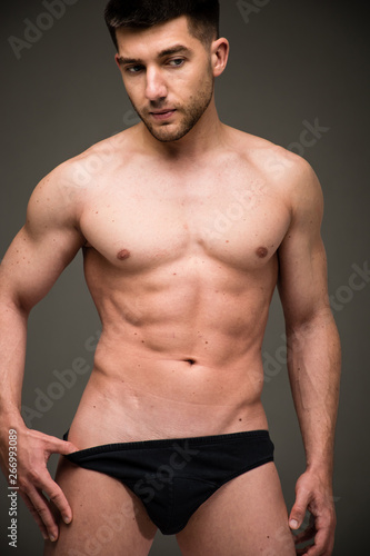 © arrideo, Fototapeta premium Handsome young man posing in black underwear (studio photoshoot)