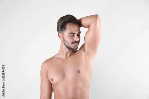 Fototapeta premium Handsome young man showing armpit on white background. Using deodorant