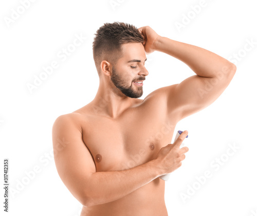 Obraz premium Handsome young man using deodorant on white background