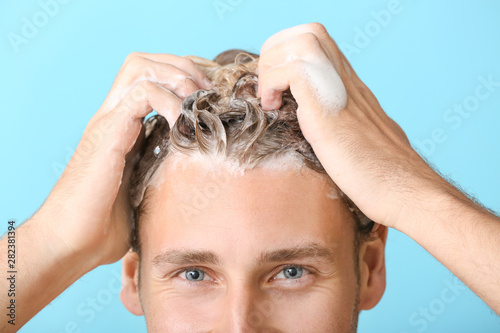 © Pixel-Shot, Fototapeta premium Handsome young man washing hair against color background, closeup