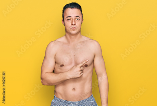 Fototapeta premium Handsome young man wearing swimwear shirtless pointing aside worried and...