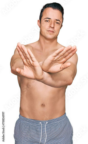 Fototapeta premium Handsome young man wearing swimwear shirtless rejection expression crossing...