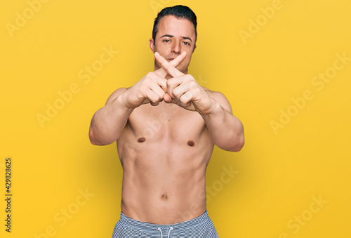 Fototapeta premium Handsome young man wearing swimwear shirtless rejection expression crossing...