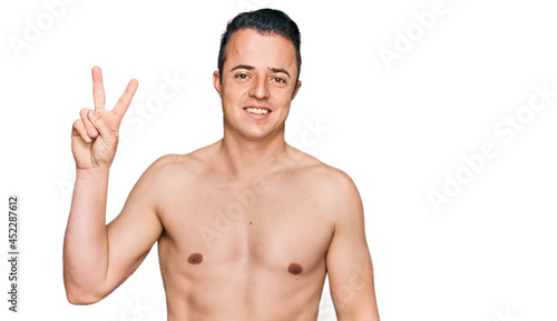 © Krakenimages.com, Fototapeta premium Handsome young man wearing swimwear shirtless showing and pointing up with fingers number two while smiling confident and happy.