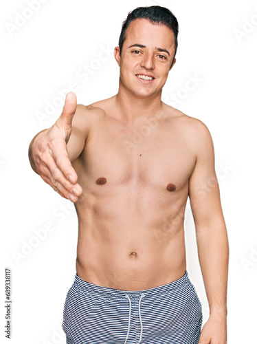 Fototapeta premium Handsome young man wearing swimwear shirtless smiling friendly offering handshake as greeting and welcoming. successful business.