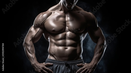 © Artvibe, Fototapeta premium Handsome young man with muscular body and tattooed torso standing over dark background.generative ai