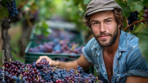 © AS Photo Family, Fototapeta premium Handsome Young Man Working As Winemaker In His Vineyard During Harvest Season