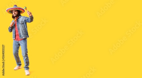 Fototapeta premium Handsome young Mexican man in sombrero and with maracas on yellow background with space for text