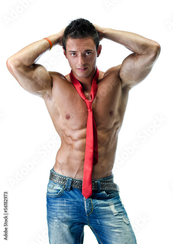 © theartofphoto, Fototapeta premium Handsome young muscle man naked, wearing only jeans and necktie