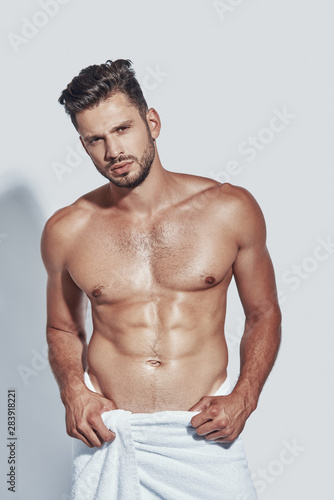 Fototapeta premium Handsome young shirtless man looking at camera while standing against grey...