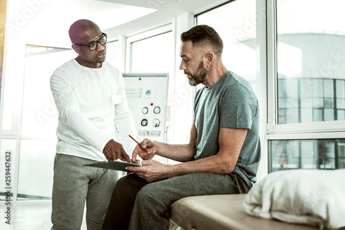 © zinkevych, Obraz premium Handsome young therapist pointing at important document