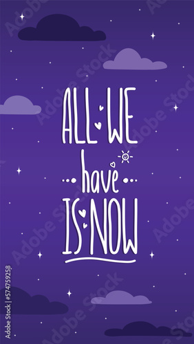 Fototapeta premium Handwriting simple text All We Have is Now. Isolated on colorful background. Decorated with little hearts and sun.