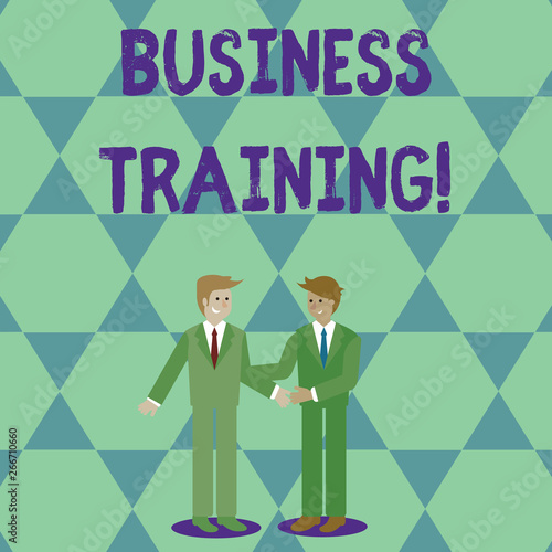 © A, Obraz premium Handwriting text Business Training. Conceptual photo increasing the knowledge and skills of the workforce Two Businessmen Standing, Smiling and Greeting each other by Handshaking
