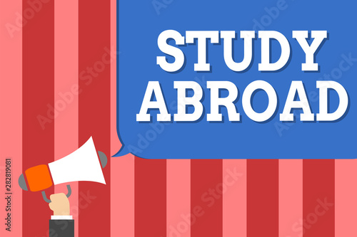 © Zofia, Fototapeta premium Handwriting text writing Study Abroad. Concept meaning Pursuing educational opportunities in a foreign country Man holding megaphone loudspeaker speech bubble message speaking loud