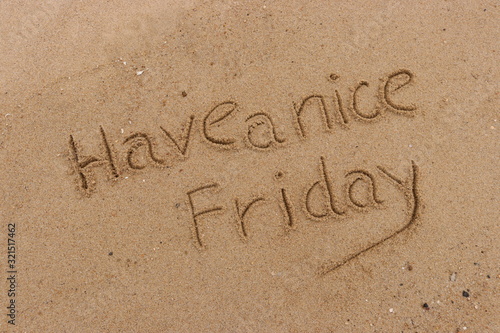 © kaesunza, Fototapeta premium Handwriting words "Have a nice Friday." on sand of beach.