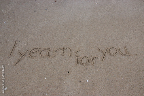 © kaesunza, Fototapeta premium Handwriting words "I yearn for you." on sand of beach.