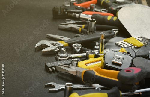 Fototapeta premium Handyman tool kit on black wooden table. Many wrenches and screwdrivers,...