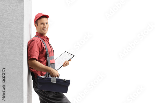 Fototapeta premium Handyman with a clipboard and a toolbox leaning against wall