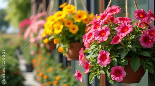 Fototapeta premium Hanging baskets filled with a variety of blooming flowers in a sunny garden. Bright, cascading petals create a cheerful and lively atmosphere.