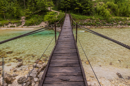 Fototapeta premium Hanging bridge over Soca river near Bovec village, Slovenia